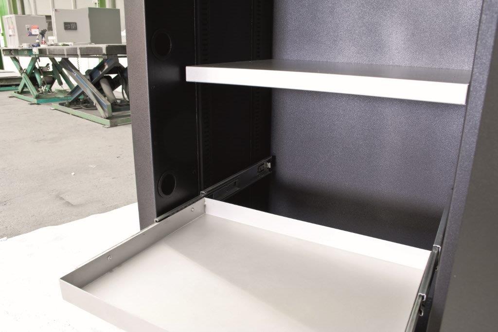 - Półki o regulowanej wysokości montażu w standardzie. Dodatkowo sejf wyposażyć można w zamykaną szufladę, skrytkę czy wkładkę na nośniki informatyczne.