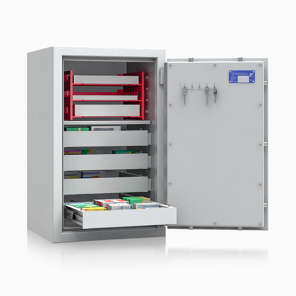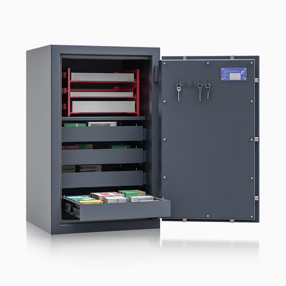 Sejfy Safe4BTM, oferowane przez renomowanego polskiego producenta ISS, to wszechstronne sejfy meblowe zaprojektowane do bezpiecznego przechowywania dokumentów, wartościowych przedmiotów i innych cennych rzeczy. Wyróżniają się unikatową konstrukcją, której rdzeniem są wysuwane szuflady wewnętrzne znacznie zwiększające codzienny komfort użytkowania. Sejfy ISS Safe4BTM charakteryzują się solidną budową i wysokim poziomem zabezpieczeń, co potwierdza certyfikat ECB-S oraz zgodność z normą EN 1143-1 (Klasa I). Ich konstrukcja obejmuje korpusy wielościankowe o grubości 25 mm oraz drzwi wielościankowe o grubości 84 mm, które są osadzone na zawiasach zewnętrznych, umożliwiających otwarcie pod kątem 180°. Drzwi posiadają czterostronne ryglowanie i profil zachodzący od strony zawiasowej. Sejfy ISS Safe4BTM z szufladami idealnie nadają się do biur, aptek i magazynów - wszędzie tam, gdzie zachodzi konieczność przechowywania cennych przedmiotów w ściśle uporządkowany sposób. Mogą być również wykorzystywanych przez firmy do ochrony dokumentacji i mienia wartościowego, jak i być niezawodnymi sejfami domowymi. Dzięki otworom montażowym w dnie i tylnej ścianie można je solidnie przymocować do podłoża lub ściany.