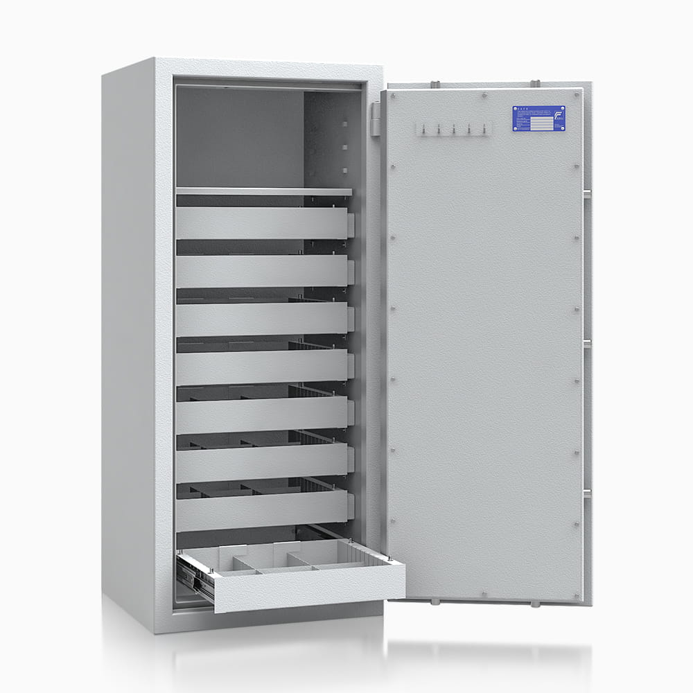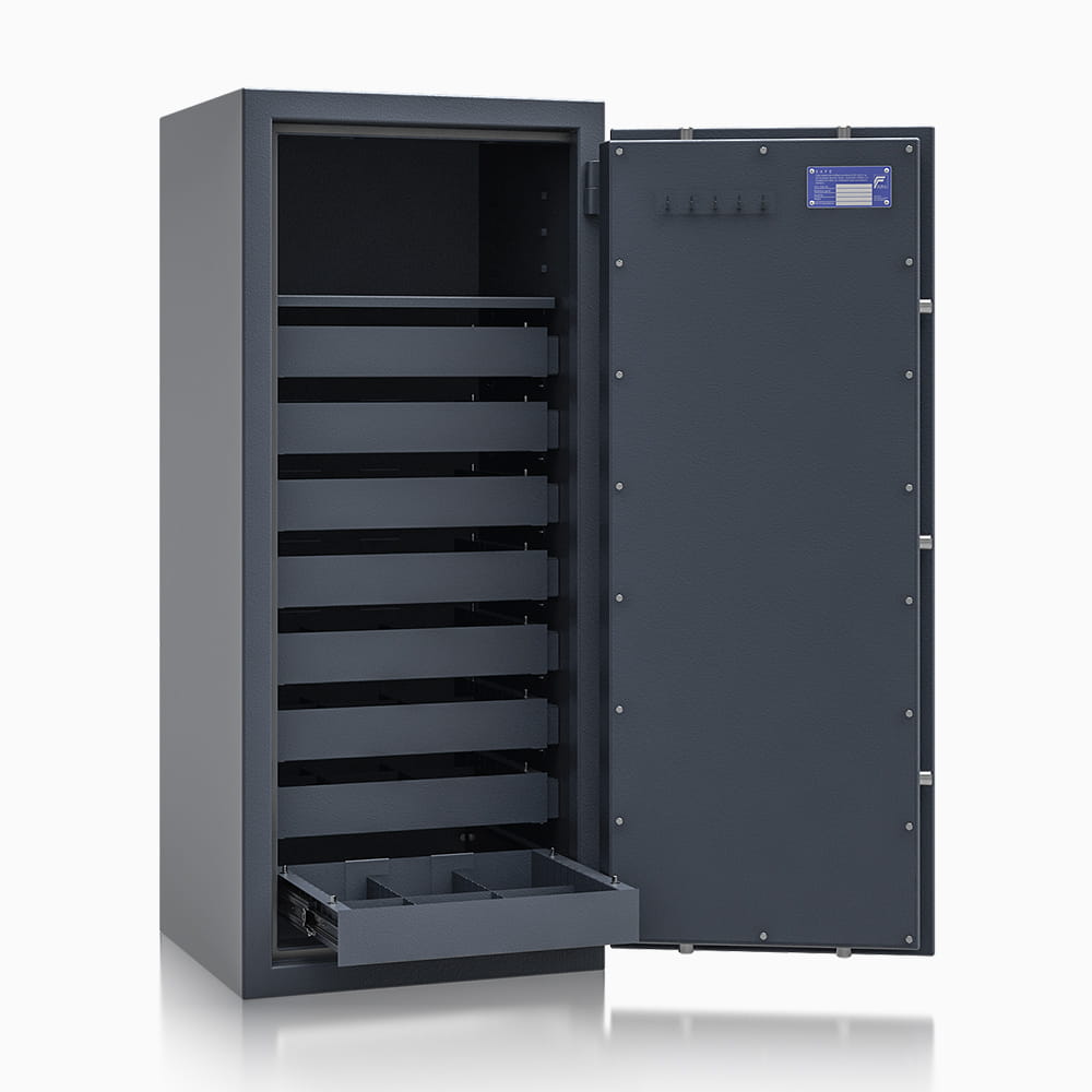 Sejfy Safe4BTM, oferowane przez renomowanego polskiego producenta ISS, to wszechstronne sejfy meblowe zaprojektowane do bezpiecznego przechowywania dokumentów, wartościowych przedmiotów i innych cennych rzeczy. Wyróżniają się unikatową konstrukcją, której rdzeniem są wysuwane szuflady wewnętrzne znacznie zwiększające codzienny komfort użytkowania. Sejfy ISS Safe4BTM charakteryzują się solidną budową i wysokim poziomem zabezpieczeń, co potwierdza certyfikat ECB-S oraz zgodność z normą EN 1143-1 (Klasa I). Ich konstrukcja obejmuje korpusy wielościankowe o grubości 25 mm oraz drzwi wielościankowe o grubości 84 mm, które są osadzone na zawiasach zewnętrznych, umożliwiających otwarcie pod kątem 180°. Drzwi posiadają czterostronne ryglowanie i profil zachodzący od strony zawiasowej. Sejfy ISS Safe4BTM z szufladami idealnie nadają się do biur, aptek i magazynów - wszędzie tam, gdzie zachodzi konieczność przechowywania cennych przedmiotów w ściśle uporządkowany sposób. Mogą być również wykorzystywanych przez firmy do ochrony dokumentacji i mienia wartościowego, jak i być niezawodnymi sejfami domowymi. Dzięki otworom montażowym w dnie i tylnej ścianie można je solidnie przymocować do podłoża lub ściany.