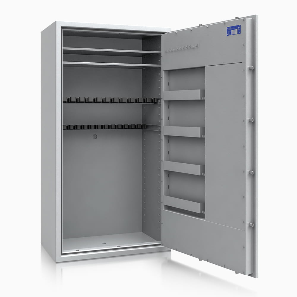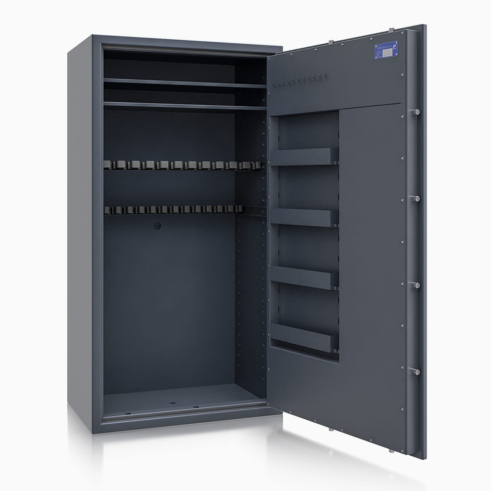 Prezentowany sejf na broń długą ISS St. Gallen WF MAX to renomowane zabezpieczenie przeznaczone do bezpiecznego przechowywania broni długiej i krótkiej, amunicji, ważnych dokumentów, mienia oraz rzeczy wartościowych. Wykazuje odporność antywłamaniową na poziomie zgodny z Klasą I według normy EN 1143-1.